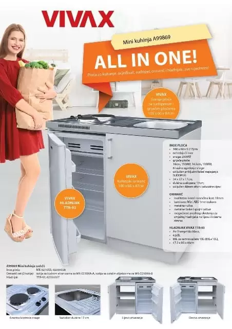 Mini kuhinja Vivax je sve u jednom-ploča za kuhanje, ocjeđivač, sudoper, ormarić i hladnjak. Idealna za manje prostorije. U odabranim Bingo marketima poražite mini kuhinju Vivax po super cijeni 769,00 KM.