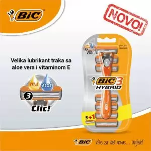 Probajte novi BIC3 Hybrid brijač sa tri oštrice, pokretnom glavom i velikom lubrikant trakom sa aloe vera i vitaminom E.