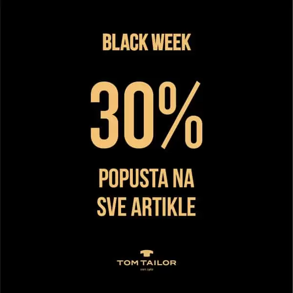 U Tom tailor trgovinama očekuje vas BLACK WEEK. Ostvarite 30% popusta na sve artikle.