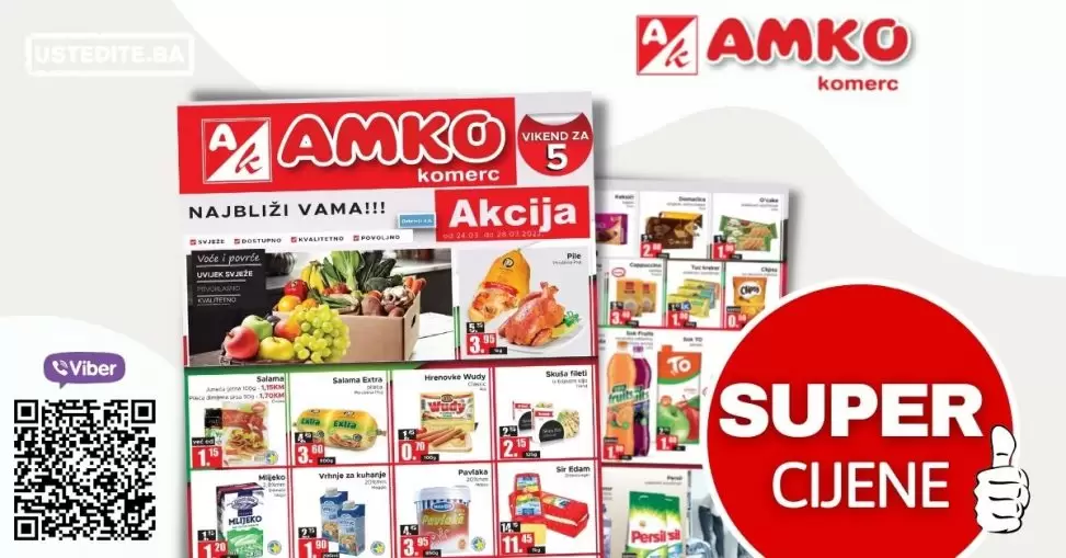 Amko vikend za 5! Amko vikend ponuda donosi nam super akcijske cijene prehrambenih proizvoda. Mliječni asortiman, mesne preradjevne, svježe meso, voće i povrće samo je dio super Amko katalog-a! Uštedite novac! Pratite sniženja i aktuelne kataloge! Amko vikend akcija 24-28.03.2022. godine!