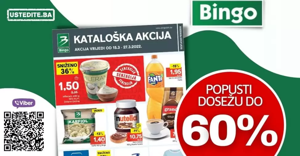 Nova Bingo akcija/Bingo katalog donosi nam sjajne popuste i do 60%! U novom Bingo katalogu pronaći ćete prehrambene proizvode, proizvode za njegu i higijenu, proizvode za čišćenje kuće po akcijskim/sniženim cijenama. Očekuje vas veliki izbor tekstila po super cijenama. Bingo akcijski katalog 15-27.03.2022. godine!