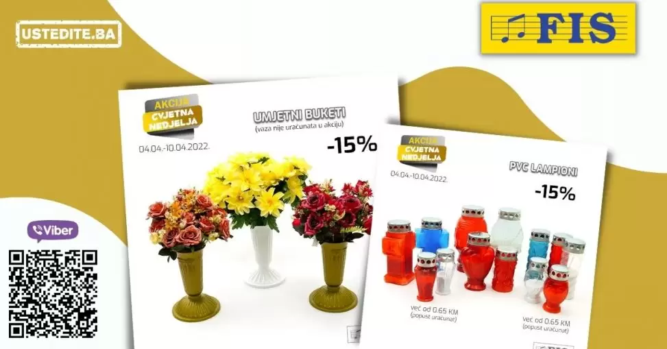 Povodom blagdana Cvjetna nedjelja u FIS prodajnim centrima potražite posebnu ponudu i popust od 15% na asortiman lampiona, umjetnih buketa i svijeća.