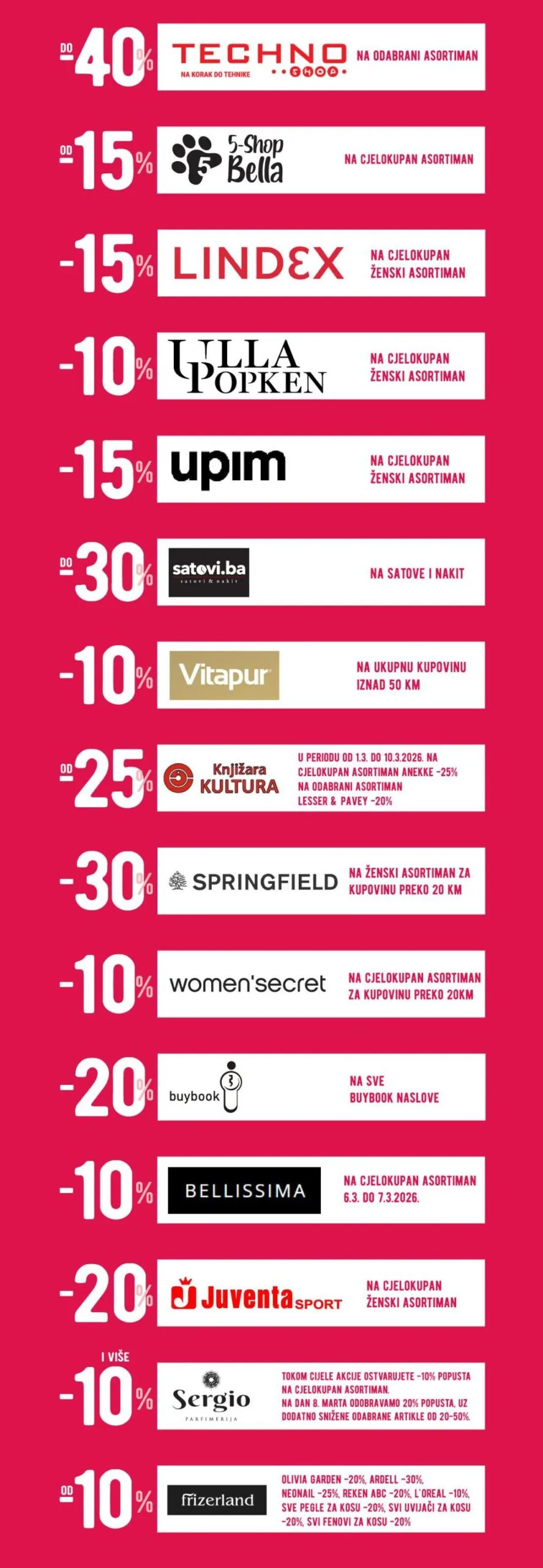Mercator Shopping Days donose odličnu priliku za kupovinu uz sniženja do 40% u brojnim prodavnicama u Mercator centrima. Iskoristite posebne ponude na tehniku, modu, kozmetiku, knjige, satove, nakit i još mnogo toga, uz dodatne popuste na odabrane brendove. U akciji učestvuju brojni poznati brendovi i prodavnice, pa vas očekuju atraktivne cijene i posebne pogodnosti za kupovinu. Pronađite savršene poklone, osvježite garderobu ili uljepšajte svoj dom uz odlične ponude.