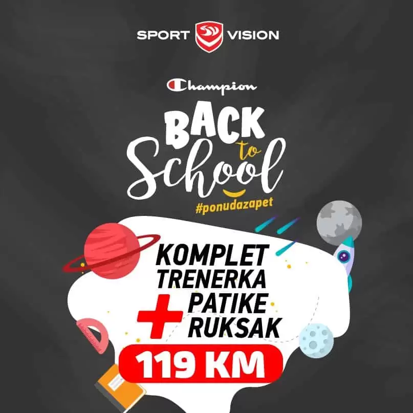 Sport Vision pogodnosti za školarce . Od 15.08. nabavite Champion komplet trenerku, ruksak i patike po cijeni od samo.119KM. Učinite spremanje za nove školske dane što lakšim i…