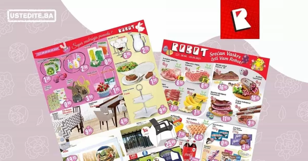 HIT ponuda! Robot vikend akcija 23-25.04.2021. godine! Izdvajamo: Svježa jaja 30 komada samo 4,25 KM Batak sa karabatakom 1 kg samo 2,95 KM Kafa Jubilarna Franck 500 gr…