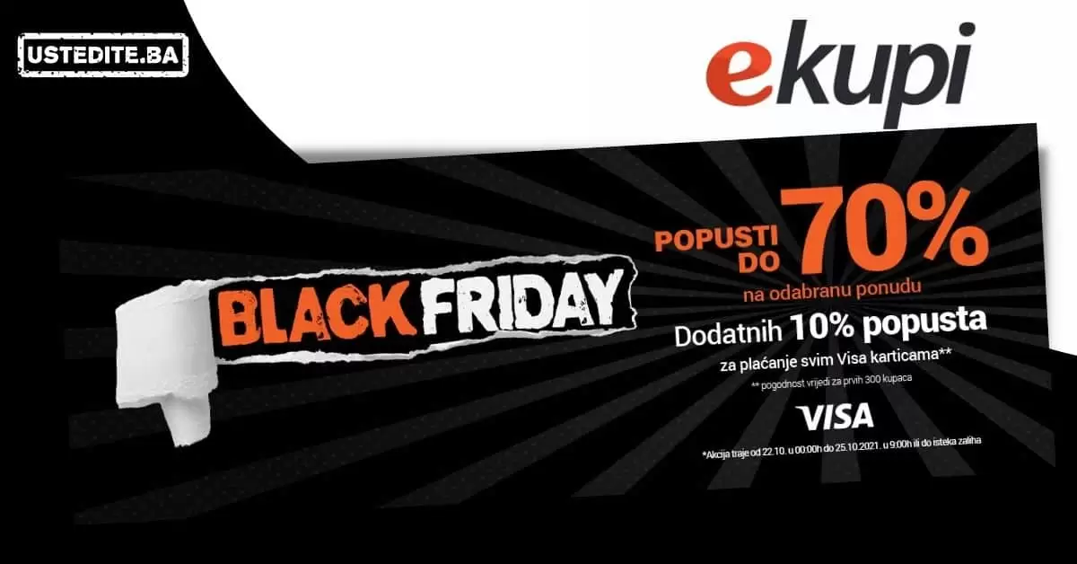 ekupi je ove godine odlučio ranije donijeti odlične popuste čak do 70%. Iskoristite brojne pogodnosti i 10% dodatnog popusta na sve VISA kartice za prvih 300 kupaca! eKupi Blck…