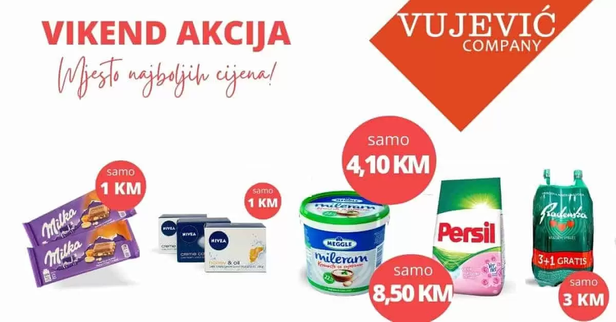KUPUJEM I ŠTEDIM! Nevjerovatno niske cijene! Vujević vikend akcija 11-12.9.2020. godine! PERSIL 4 kg 8,50 KM RADENSKA Mineralna voda 1.5 L samo 3,00 KM! Vujević vikend…