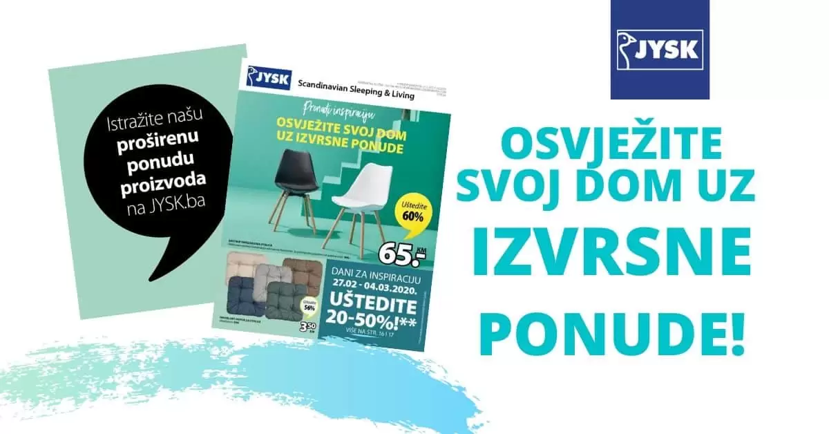 Istražite našu proširenu ponudu proizvoda na JYKS.ba! Jysk akcijski katalog 5-18.3.2020. godine! Uštedite do 42%! 50% uštede čeka na vas! Fantastična trpezarijska stolica snižena je 40%. 60% ušteda,…