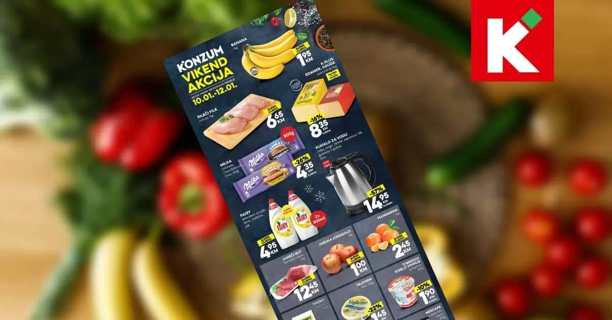 Nevjerovatnu ponudu donosi nam nova Konzumova vikend akcija. Banane samo 1,95 KM. PIleći file samo 6,65 KM. Mika 300 gr. samo 4,35 KM. Kuhalo za vodu na sniženju…