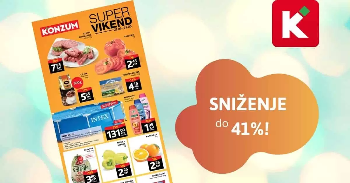 Sniženje do 41%! Konzum vikend akcija 29-31.5.2020. godine! Izdvojeno iz ponude: NILA deterdžent za veš -41%, akcijska cijena 7,95 KM Palmolive šampon -34%, akcijska cijena samo 1,95 KM…